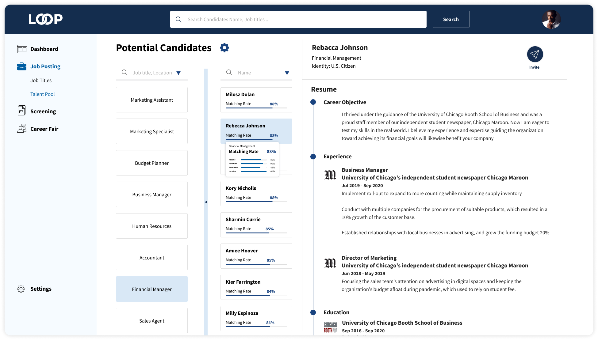 The talent pool allows recruiters to see all the candidates who sign up in Loop. It provides resumes, referrals, and qualifications for recruiters. Recruiters can see the potential candidates under each job title and invite them to apply for the job.